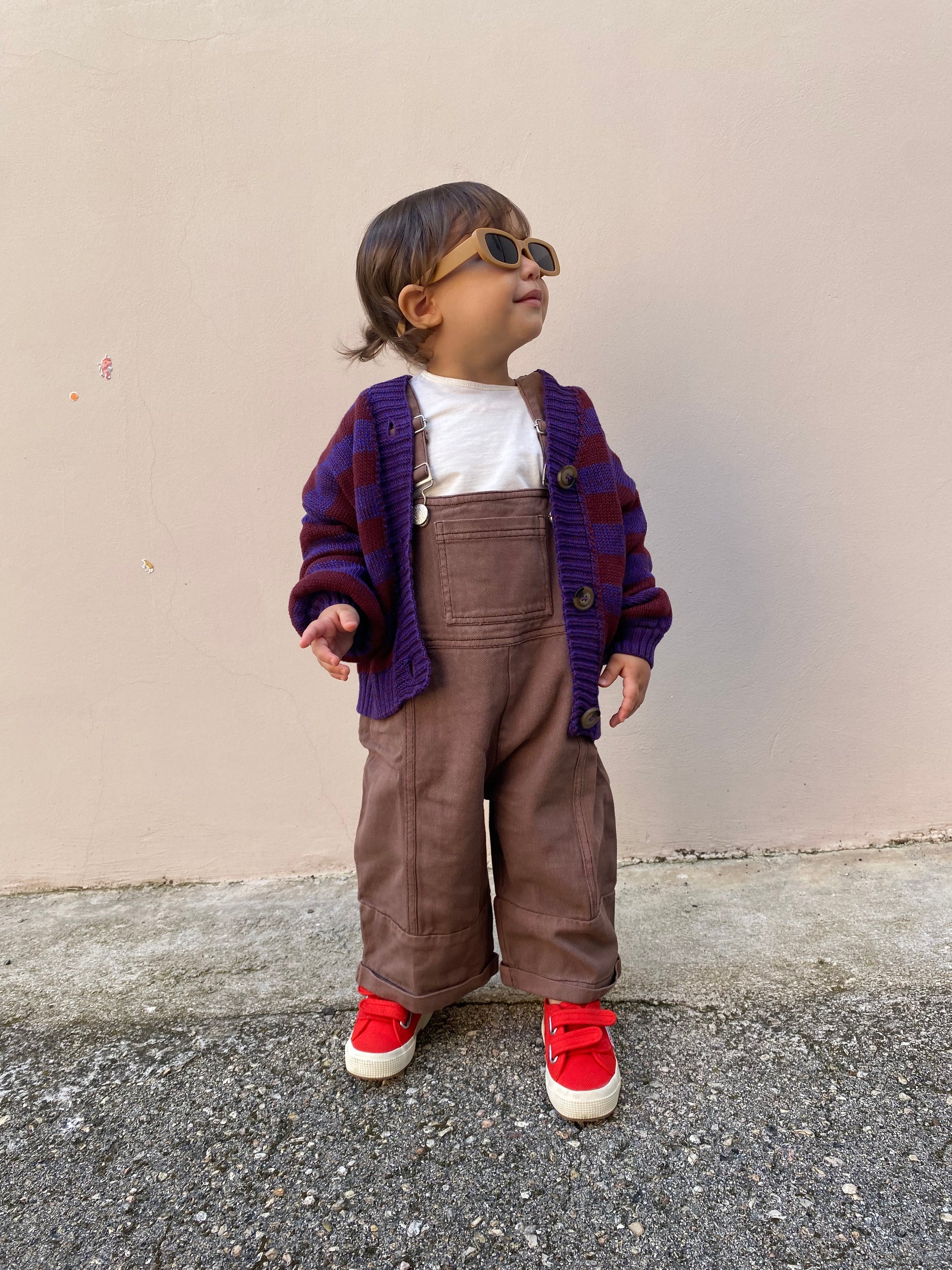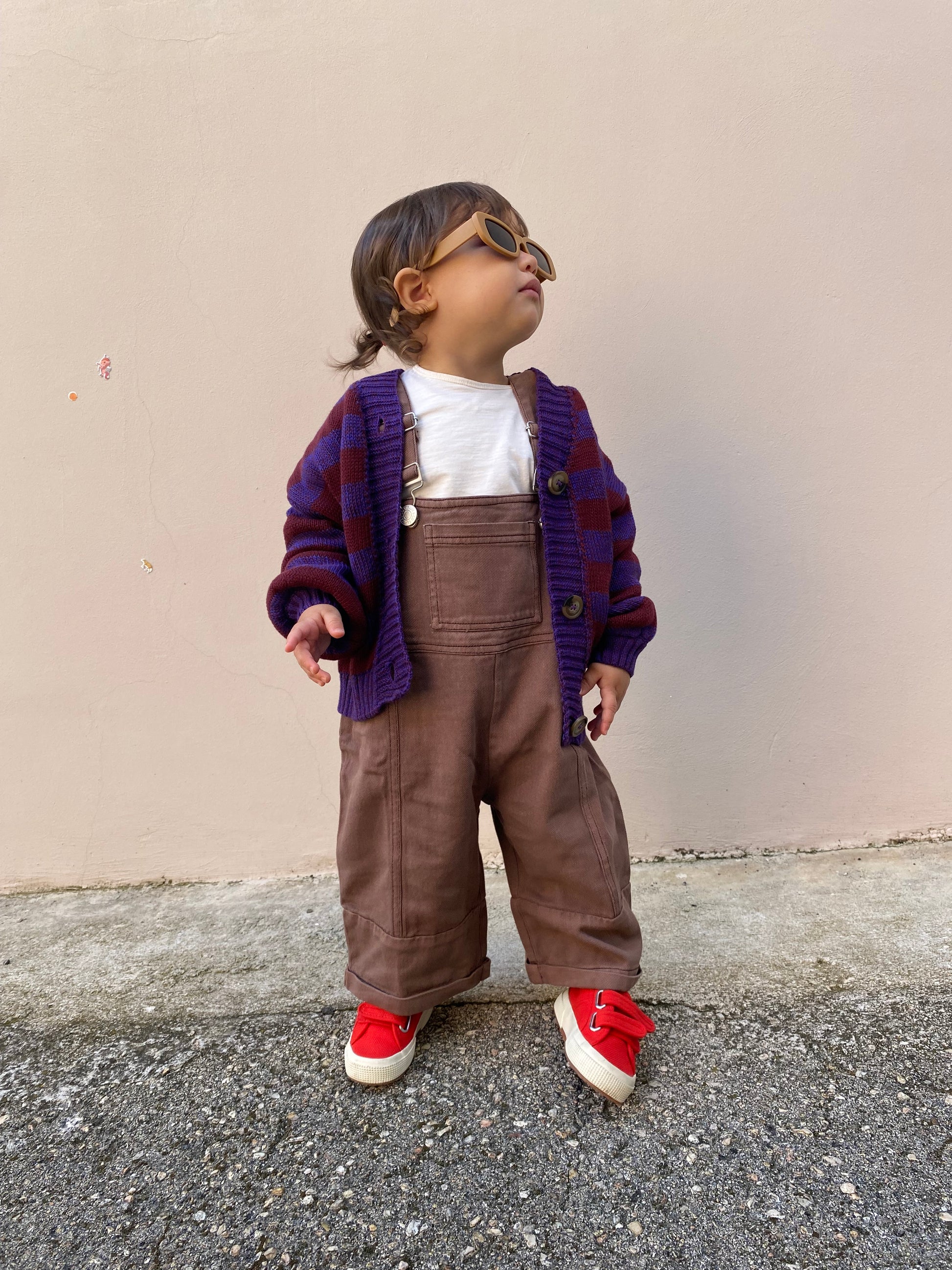 Cardigan oversize unisex a righe orizzontali marroni e viola.